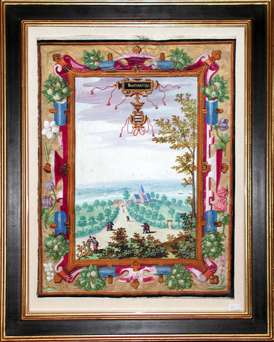 These particular views originate from the Album d’Authal, one of the few that until recently remained in the collection of the Arenberg family. It covers three groups of Charles de Croÿ’s properties in four different regions: Brabant, Flanders, Artois, Picardy, and Namurois. The watercolors as a whole are a amalgam of the pictorial and the cartographic. De Montigny was not a surveyor but an artist by training, and he drew heavily on the original maps done by Pierre de Bersacques, supplementing and frequently altering them in conjunction with his own observations and imaginative touches. As a result of this unusual combination, there are few precedents for such a hybrid luxury production of equal scope and splendor as the albums. Books of Hours, such as the most famous, the Tres Riche Heurs done by the Limbourg brothers in the 15th century for Jean, Duc de Berry, sometimes include similar subject matter but tend to be much smaller in scale than the Albums de Croÿ, which are too large and elaborate to be categorized as books of miniatures.