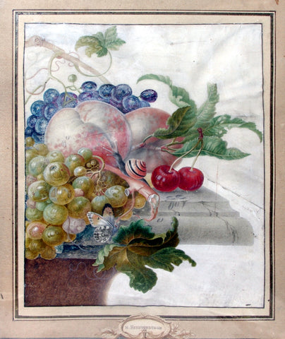 In brief, the Greek artist competed against his contemporary, Parrhasius, to paint grapes--although Zeuxis’ naturalistic work fooled birds that attempted to eat the grapes, his competitor won the contest, misleading Zeuxis by claiming that his grapes were behind a curtain. As it turned out, the curtain was painted, tricking the other painter, Zeuxis, who conceded. While not exactly lifelike, beautified by the intensity of the pigment used, the attractiveness of Henstenburgh’s fruits, such as peaches, raspberries, and cherries, implies the artist’s interest in exemplifying the extent of nature’s perfection, rendering them as seemingly edible as Zeuxis’ grapes. In his day job as a baker, he specifically made pies, and, being closely acquainted with the fruit depicted in his watercolors, the artist’s familiarity with the subject matter gives reason to its successful execution. Still, further meaning can be derived from the motif of a bunch of grapes as it became representative of female chastity in Jacob Cats’ literary works of the 17th century which influenced later writers of the period. Further, another possible reading suggests that the vine, or tendril, of a grape is representative of the Virgin while the grapes themselves symbolize Christ. Considering these multiplicities of meaning, Henstenburgh’s works call out to viewers to become more involved with the work by drawing their own conclusions.