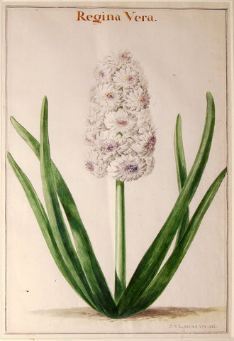 This manuscript dedicated to the hyacinth plant is considered by many to be the apex of this Dutch artist’s oeuvre and was once owned by Prince Charles de Rohan, one of Madame Pompadour’s favorites. The Oak Spring collection, as well as our selection of Van Loo hyacinths, boldly fill the page with vibrant color and rich green leaves that seem to wave in a light breeze. Scholar Lucia Tomasi noted in An Oak Spring Flora: Flower Illustration from the Fifteenth Century to the Present Time: A Selection of the Rare books, Manuscripts, and Works of Art in the Collection of Rachel Lambert Mellon (1997), that our L’Admiration, is closely related to the Oak Spring album.